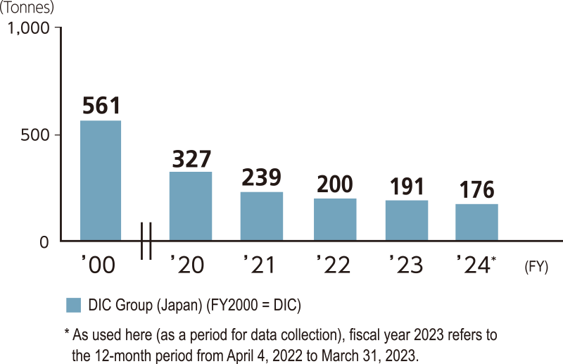 The DIC Group in Japan succeeded in achieving its voluntary target for reducing emissions of VOCs into the air for fiscal year 2010—30% from the fiscal year 2000 level—in fiscal year 2007. The Group has since raised this target to a 50% decrease from the fiscal year 2000 level, and has set a goal of maintaining its emissions of VOCs at this level. In fiscal year 2024, DIC Group companies in Japan reported total emissions of VOCs of 176 tonnes, a decline of 8% from fiscal year 2023. DIC Group companies in the People’s Republic of China (PRC) and the Asia–Pacific region also continue to conduct careful monitoring of VOC emissions. In the PRC, in particular, the Group is updating equipment and stepping up emissions management practices in response to the tightening of pertinent local regulations. The Group previously collected data for the 12-month period from January through December, but effective from fiscal year 2023 this has been changed to April through March of the following year, consistent with the reporting period specified in the aforementioned law.